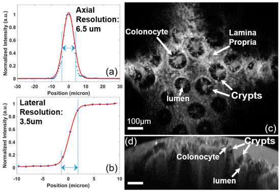Fluorescence imaging results of the NIR fluorescence intraoperative confocal microscope. (a) Lateral and (b) axial resolution at the wavelength of 785 nm (focus at 150 µm out of the SIL) by measuring the FWHM in the reflective mode; ex vivo fluorescence images of human colon tissue specimens demonstrated “histology-like” imaging with a large field-of-view (up to 1000 µm), in both the (c) en face horizontal cross-sectional image at the 150-µm depth and (d) vertical cross-sectional image; crypts, colonocytes, and lumen have been visualized with cellular resolutions, scale bar: 100 µm.