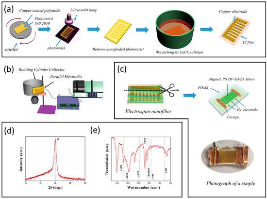 (a) Schematic diagram of flexible parallel copper electrode fabrication, (b) the schematic of electrospinning progress, (c) nanogenerator fabrication, (d) X-ray diffraction (XRD) pattern of the P(VDF-TrFE) nanofibers, (e) infrared spectra of the P(VDF-TrFE) nanofibers.