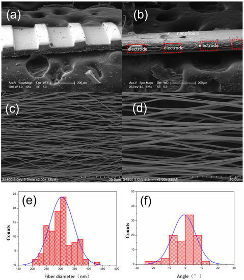 Figure 2a presents scanning electron microscopy (SEM) images of the flexible parallel copper electrode, it clearly shows that the electrodes have uniform size. And the width of the electrode is about 100 μm, the gap of the electrode is about 200 μm. The height of the electrode is about 50 μm. Figure 2b shows the side view SEM image of P(VDF-TrFE) nanofibers and electrode after the electrospinning process. The fiber is fully stretched across the gap between two electrodes, and the thickness of the fiber is less than the electrode height. Figure 2c,d show the top view SEM images of the nanofibers, the diameter of the P(VDF-TrFE) nanofibers is uniform, the fibers are laterally aligned on the parallel electrodes. We used Image-pro plus software to calculate the diameter and orientation distribution, as shown in Figure 2e,f, it can be seen that electrospinning nanofibers diameter distribution range is 200–450 nm, concentrating between 250–350 nm, while angle distribution range is −15°~20°, mainly concentrating in the area of ±10°.