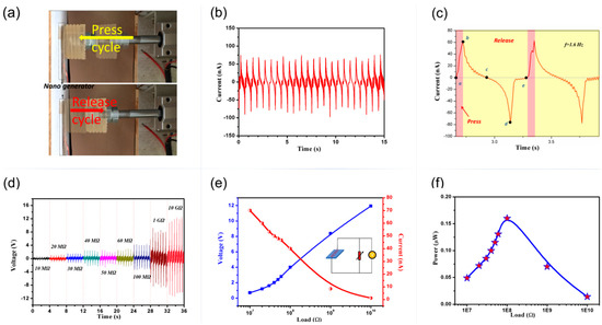 The piezoelectric performance of the device was tested on a purpose-built platform. A controlled dynamic impact was programmed to apply mechanical force by periodically pressing and releasing the device, the periodic pressure applied on PENG is about 2 kPa, as shown in Figure 4a. The induced output voltage was collected using a digital storage oscilloscope (TDS 2012B, Tektronix, Cleveland, OH, USA) and the short circuit current was measured by an electrochemical workstation (CHI 660 C, CH instruments, Shanghai, China). The resulting short circuit current and output voltage, detected at a loading frequency f = 1.6 Hz are shown in Figure 4b,f, respectively. The peak-peak short-circuit current is about 150 nA. The current generation mechanism is shown in Figure 4c: During the press cycle (part a–b), the nanofibers deformed from the original state (point a) to the maximum state (point b). The deformation quantity of the nanofibers was controlled and affected by external force. It increased from point a to b when pushing ahead, and reached highest in point b when the compression quantity was biggest. During the release cycle (part b–e), the stress released, the P(VDF-TrFE) nanofibers returned from the maximum strained position (point b) to the original strain-free state (point e), and the piezoelectric potential between the two sides disappeared. Simultaneously, the accumulated charges flowed back in the opposite direction, generating a negative electrical signal. The time of the pushing between two pulses peak was about 0.32 s, which was corresponding to the loading frequency of the external force.