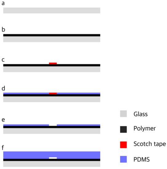 Fabrication procedure: (a) Substrate; (b) Polymer coating; (c) Scotch tape pasted over the polymer layer; (d) poly-dimethylsiloxane (PDMS) coating; (e) Removal of the Scotch tape; (f) Sealing with PDMS slab with the microchannel imprinted in it.