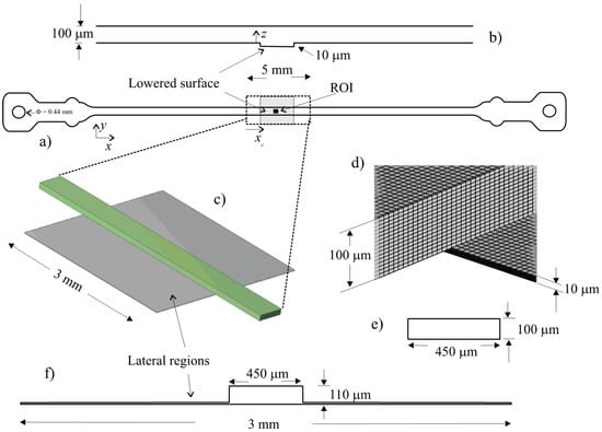 A section of the microchannel, around the visualization region, was selected for simulation domain (Figure 2c). This region includes the lowered surface, which results from the fabrication method, where the region of interest is located. The length of the domain is 5 mm. The lowered surface has a length of 3 mm and a width of 3 mm. The lowered surface level is approximately 10 μm. The cross section available for flow in the lowered surface region is shown in Figure 2f. Outside the lowered region the cross section available for the flow is rectangular (Figure 2e). A detail of the mesh used is shown in Figure 2d.