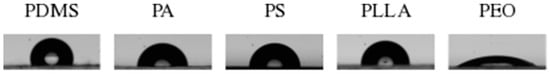 Water droplet over the surfaces of PDMS, PA, PS, poly-l-lactide acid (PLLA) and Polyethylene oxide (PEO) illustrating the hydrophobicity of the materials.