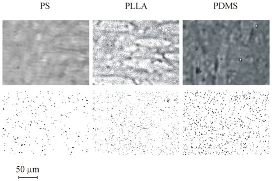 Images for adhesion in different materials for t = 1800 s: PS, PLLA and PDMS. Top row is before and bottom row after image processing. Results obtained for nominal wall shear stress of 0.02 Pa.