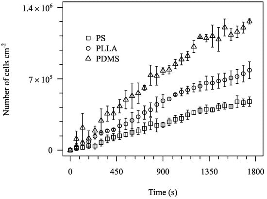 Adhesion tests were performed for all 5 materials cited in Table 3. A subset of the results obtained (for PS, PLLA and PDMS) is represented in Figure 4. The images show the surface after 1800 s assays and the processed images. Cells are visible in all three surfaces studied and so the images can be processed to obtain a clean image for cell counting. Adhesion data for the 1800 s of test are shown in Figure 5. The data show that different materials have distinct adhesion behaviour. A higher bacterial adhesion was observed on the PDMS surface during the 1800 s assay while a lower bacterial adhesion was observed on the PS surface. Additionally, it was observed that bacterial adhesion increases linearly with time. Additional results are shown for PA and PEO in Figure 6 and Figure 7.