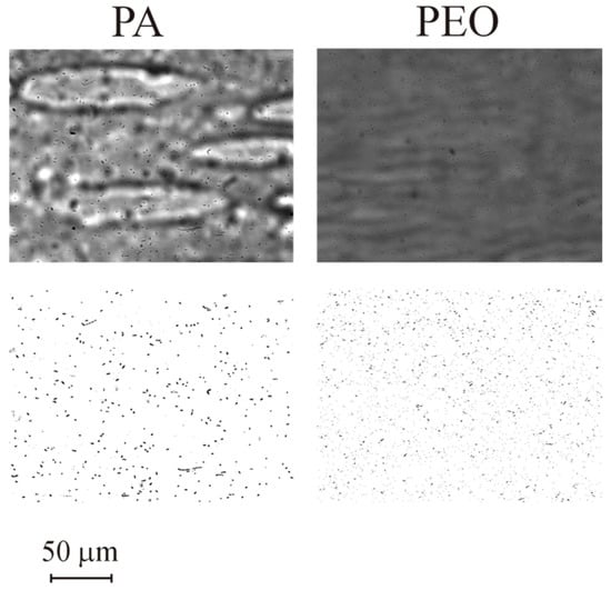 Images for adhesion in different materials for t = 1800 s: PA and PEO. Top row is before and bottom row after image processing. Results obtained for nominal wall shear stress of 0.01 Pa.