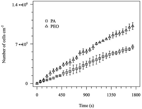 Number of adhered cells per cm2 for PA and PEO for nominal wall shear stress of 0.01 Pa.