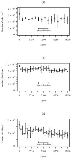 Cell density after 1800 s of adhesion on PDMS for three different nominal wall shear stresses. (a) WSS = 0.02 Pa; (b) WSS = 0.2 Pa; (c) WSS = 1 Pa.