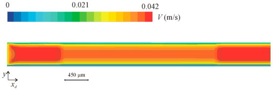 Numerical simulations were made with the commercial code Ansys Fluent CFD package (version 14.5) by solving Navier–Stokes equations. A model of the microchannel was built in Design Modeler 14.5 and was discretized into a grid of 278,000 cells by Meshing 14.5. The QUICK scheme [] was used for the discretization of the momentum equations and the PRESTO! scheme for the discretization of the pressure terms. The velocity–pressure coupled equations were solved by the PISO algorithm []. The no slip boundary condition was considered for all the walls. Simulations were made in steady state mode until convergence. The properties of water (density and viscosity) at 37 °C were used.