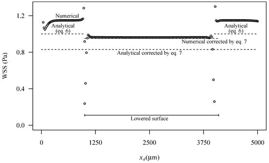 The analytical Equation (6) underpredicts the numerical WSS data in the channel outside the lowered region. This result is expected since the analytical equation is exact only for channels with an infinite width. In the present case the ratio between the width and the height of the channel is 4.5, which implies that the velocity is higher than what would be in a channel with infinite width.