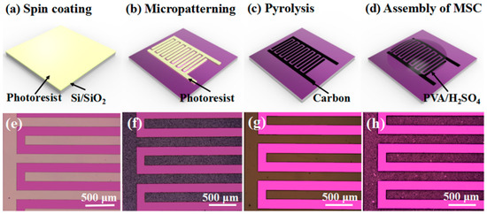 Figure 1a–d demonstrate the microfabrication process of MSC with CNT modification and include three processes: The Si/SiO2 substrate was cleaned, followed by a baking process. After that, spin coating and photolithography processes were conducted to obtain a uniform interdigital GM-1060 negative photoresist layer on the substrate. Afterwards, the sample was soaked in PGMEA/CNTs for development, followed by annealing treatment to obtain pyrolyzed carbon/CNT microelectrodes.