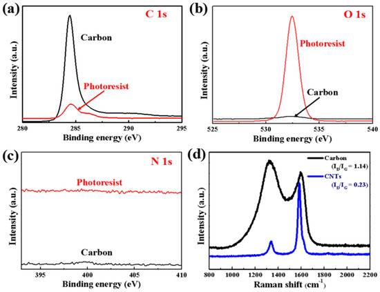 (a–c) XPS curves of GM-1060 photoresist and pyrolyzed carbon. (d) Raman spectra of pyrolyzed carbon and CNTs.