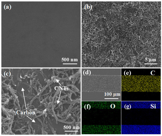 Figure 3a–c show SEM images of the surface of pyrolyzed carbon, and low-magnification and high-magnification SEM images of the carbon/CNT microelectrode surface. Different from the typical morphology of pyrolyzed carbon shown in Figure 3a, the CNT network is formed on the surface of carbon/CNT microelectrodes, as shown in Figure 3b,c. Interestingly, during the development process, the CNTs firmly adsorbed on the surface of GM-1060. After pyrolysis, CNTs near the surface of pyrolyzed carbon were well bonded with the surface of carbon. Figure 3d shows an SEM image of a carbon/CNT microelectrode. The networking structure of carbon/CNTs will provide higher surface area than that of pyrolyzed carbon for energy storage. Figure 3e–g show the C/O/Si element distribution in the microelectrodes, which indicates that C is the main element in pyrolyzed carbon.