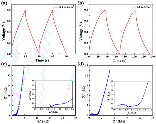 (a,b) GCD curves of carbon-MSC and carbon/CNT-MSC at a current density of 0.1 mA/cm2. (c,d) Electrochemical impedance spectroscopy (EIS) results of carbon-MSC and carbon/CNT-MSC with a frequency range from 0.01 to 100,000 Hz.