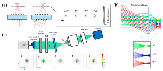 Focal spot characterization for different angles of incidence source. (a) (left) Schematic illustration of focusing of on-axis and off-axis light by a metasurface doublet lens. (right) Simulated focal plane intensity for different incident angles. (Reproduced from [24] with permission.) (b) The Ray diagram obtained by adding the aperture meta-lens resulting in diffraction-limited focusing along the focal plane. (c) Focal spot measurement setup. (1–5) Focal spot intensity profile at (1) 0°, (2) 6°, (3) 12°, (4) 18°, (5) 25° incidence angle. (Reproduced from [25] with permission.)