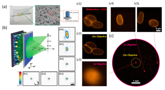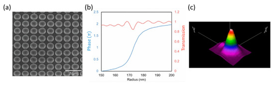 Metalens-based confocal microscope system. (a) TiO2 nanoresonator array. (b) Phase and transmission vs. nanodisc radius by FDTD simulation. (c) a 3D intensity laser-focused spot profile. (Reproduced from [93] with permission.)