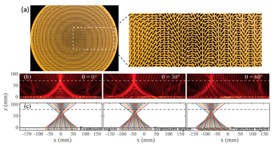 Performance of the wide-angle flat lens. (a) Perspective and zoom view of the wide-angle flat lens. (b) Simulated light intensity distributed on the plane at 19 GHz electric field distributions. (c) Ray trajectories of 19 GHz before and after propagating through the flat lens. Left, middle, and right panels of (b) and (c), respectively, represent the cases of = , , (Reproduced from [28] with permission.)