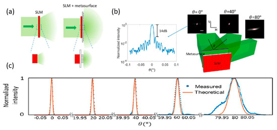 Wide-angular-range and high-resolution beam steering by a metasurface-coupled phased array. (a) The comparison of steering range of a single SLM structure and a metasurface-coupled SLM structure. (left) without the metasurface, the SLM can provide only a small diffraction envelope. (right) With the metasurface-coupled SLM structure, since each scatterer is subwavelength, the steerable range can span from −90 to +90. (b) Illustration of the steering scheme (c) 1D far−field beam shapes at other steering angles. Red lines denote the theoretical shapes of the beams. Blue dots denote the measured data. (Reproduced from [29] with permission.)