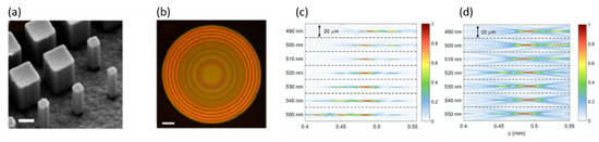 With the significant progress in nano-fabrication, researchers not only focus on high-resolution imaging but also exploit the diffractive optics system by overcoming more fundamental problems, such as chromatic aberration. Like the traditional refractive lenses, new techniques have been demonstrated for focusing on multiple different wavelengths’ incident light with the same focal length. Traditionally, for apochromatic and super-achromatic lenses [30], macro- or meso-scale manufacturing methods are complex. However, the metasurface provides a new approach because the flexible shape of the electromagnetic field [31] can be modified by changing the phase profile. Capasso’s group [32] reported that the phase realization process and interference mechanism result in large chromatic aberrations in diffractive lenses. For the dielectric-based metalens [5], the phase shifter, nanopillars, acts as a truncated waveguide with predetermined dispersion. To realize achromatic metalenses, the key is to optimize the phase shifters’ geometric parameters (Figure 5a) by satisfying the phase coverage from 0 to 2 with different wavelength dispersion [33]. The fabricated achromatic metalens (AML), shown in Figure 5b, has more advantages and overcomes the existing optics problems. The primary goal is to maximize the phase coverage. Second, the phase shifters guarantee polarization-insensitive operation for AML. To characterize the performance of the AML, the focal distance for different wavelength incident light was measured (Figure 5c). The simulated focal point intensity is shown in Figure 5d. Even for different wavelength incident light, the focal spots have a perfect shape at the same distance (z = 485 µm). The results show a theoretical and experimental achromatic response, where the focal length remains unchanged with a broad bandwidth (60 nm) in the visible range.