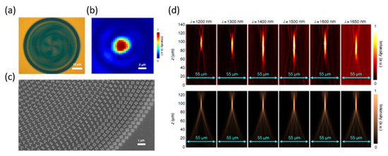 Verification of achromatic converging metalens. (a) Optical image of a fabricated metalens with NA = 0.268. (b) Measured light intensity of focal spot at incident wavelength λ = 1500 nm. (c) Zoomed-in scanning electron microscope (SEM) image of the fabricated metalens. (d) Experimental (top row) and numerical (bottom row) intensity profiles of BAML along axial planes at various incident wavelengths. (Reproduced from [35] with permission).
