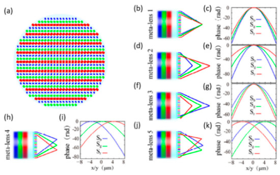 As shown in Figure 7a, there are five designed metasurface lenses. The first metalens M1 is a flat achromatic lens (f = 10 and NA = 0.6294). The schematic and phase profile of M1 are shown in Figure 7b,c. The second and third metalenses (M2 and M3) were designed as super-dispersion metalenses, shown in Figure 7d–g. For M2, it could focus the red, green, and blue light into different focal lengths (6, 10, and 17). M3 has a reversed super-dispersion where focal points of red, green, and blue light are in reverse order compared to M2. M4 and M5 are off-axis super-dispersion metalenses, shown in Figure 7h–k).