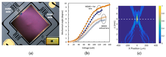 Miniaturized optical imaging and sensing systems commonly require focusing scanning or tuning mechanisms with ultra-compact size, lightweight, and fast scan speed. Micro-electro-mechanical system (MEMS) [39,40], electrowetting [41,42] and thermal tuning-based [43] methods have provided partial solutions. However, so far, these approaches are still relatively bulky and only provide a relatively slow tuning speed. Tunable focusing liquid crystal lenses [44,45,46] have been proposed for high tuning speed. However, due to the polarization dependence, the tuning speed is fully restricted. Metalenses have shown great potential for focus tuning applications. A reflective-mode metalens has been successfully integrated onto a high-speed MEMS scanner through the collaboration between Capasso’s group at Harvard University and Lopez’s group at the Argonne National Lab [47] for lateral beam scanning. Actuated by staggered comb-drives, the 2D MEMS scanner offers fast speed beam steering, high-resolution imaging, and high optical efficiency [48]. The fabricated metasurface lens was on a square substrate with side 0.8 mm and has a focal length of 5 mm with incident light 45 away from the surface, shown in Figure 8a. The metasurface lens was mounted at the center of the 2D MEMS scanner. To achieve biaxial scanning, the outer gimbal-frame rotates at a slow speed while the inner mirror scans with 9 tilting angle at high speed (~1 kHz). With an increasing voltage applied on the rotational axis, the MEMS scanner begins rotating until it reaches the maximum angles. The relationship between the applied voltage and the mechanical angle is shown in Figure 8b. To characterize the performance of the metasurface lens, the Finite Difference Time Domain (FDTD) method has been used to search for the electric field distribution (Figure 8c).