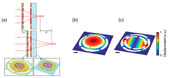 Metasurface-based MEMS device wit tunable focus. (a) Schematic illustration of the proposed tunable lens, comprised of a stationary lens on a substrate, and a moving lens on a membrane. The first (b) and second (c) mechanical resonances of the membrane at frequencies of 2.6 and 5.6 kHz, respectively. The scale bars are 100 µm. (Reproduced from [49] with permission.)
