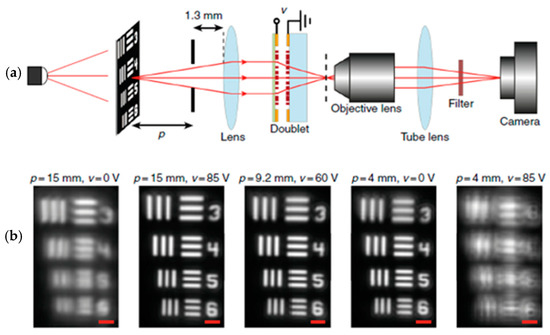Imaging with the tunable doublet. (a) Schematic illustration of the imaging setup using a regular glass lens and the tunable doublet. The image formed by the doublet is magnified and re-imaged using a custom-built microscope with a ×55 magnification onto an image sensor. (b) Imaging results, showing the tuning of the imaging distance of the doublet and glass lens combination with applied voltage. By applying 85 V across the device, the imaging distance increases from 4 to 15 mm. The scale bars are 10 µm. (Reproduced from [49] with permission.)