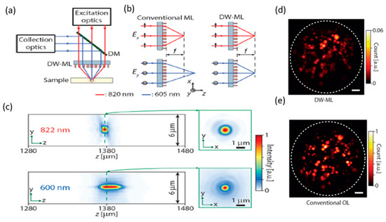 Metalens-based two-photon microscope system. (a) Schematic of a two-photon microscope employing a metasurface objective. (b) Schematic illustration of a conventional metasurface lens focusing light with different wavelengths to distinct focal lengths, and the DW-ML designed to focus 820 nm x-polarized light and 605 nm y-polarized light to the same focal distance of . (c) (Top) Measured light intensity in the axial (left) and focal (right) planes for x-polarized 822 nm illumination. (Bottom) Same results as in the top figure for a y-polarized light source with a center wavelength of 600 nm and full width at half-maximum of approximately 10 nm. (d) Two-photon fluorescent microscope image captured by DW-ML. (e) captured using a conventional refractive objective, scale bars: 10 µm. (Reproduced from [91] with permission).