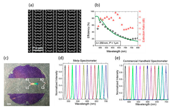 A new silicon-based off-axis metalens at near-infrared (NIR) wavelength has been demonstrated, which can provide higher spectral resolution than the conventional grating [100]. To improve the efficiency in the visible range, Capasso’s group [101] also proposed an upgraded system, which operates in the visible wavelength range (Figure 15), adding an additional process—titanium oxide atomic layer deposition (ALD) [102]. The meta-spectrometer has several advantages: (1) focusing and dispersive elements will be placed in a planar structure; (2) it can surpass traditional blazed grating such as larger dispersions; (3) with different NA metasurface structures integrated on a single substrate, multiple spectral resolutions can be achieved.
