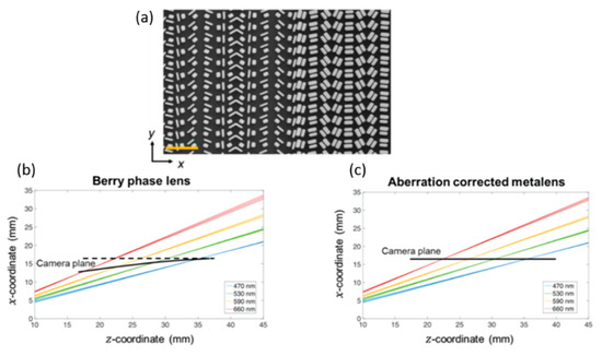 The challenges of refractive and diffractive limitations [103,104,105,106] still exist, such as curved focal plane and different wavelength aberrations, for the off-axis focusing metalenses. To resolve these, a newly developed aberration-corrected off-axis metalens [107], shown in Figure 16a, has a focal spot profile with a broad bandwidth, simultaneously engineering the phase and its higher order derivatives with respect to frequency (i.e., group delay (GD) and GD dispersion (GDD)). To achieve off-axis focusing, the phase profile of the metalens needed to satisfy Equation (3):