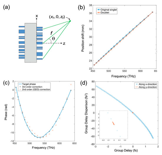 where x and y are spatial coordinates along the lens, and is the angular frequency of incident light. is the light speed in vacuum. By using Taylor expanding on Equation (2) at designed angular frequency , the phase profile can be represented by Equation (4):