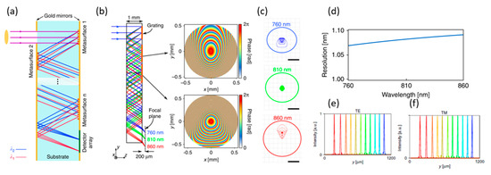 The compact spectrometer design successfully integrates a series of different wavelength band-pass filters on a single array of photodetectors [108,109]. However, such devices have system limitations in terms of resolution due to filter quality factors. Another design based on flat on-chip photonics can provide high spectral resolution [110,111,112,113,114,115], but the input on-chip coupling light losses and the reduced output are major challenges in many applications. To achieve a compact spectrometer with high resolution, Faraon’s group [106] proposed a compact folded multi-metalenses system. With only 1 mm thickness, the new spectrometer can provide 1.2 nm resolution over a broad bandwidth range (~ 100 nm) in the NIR range. A schematic is shown in Figure 18a. Multiple metalenses are micro-machined on a transparent substrate to focus and disperse the incident light to different points. Ray-tracing simulation results are shown in Figure 18b, while the spot profiles are shown in Figure 18c. A small aberration was confirmed in the range of 760 nm to 860 nm. Using the diffraction-limited Airy radius and the focus displacement by the wavelength, the resolution was calculated in Figure 18d; the theoretical value is ~1.1 nm. To characterize the performance of the designed system, one-dimensional intensity profiles are shown in Figure 18e,f for transverse electric (TE) and transverse magnetic (TM).