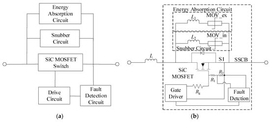 Figure 1a demonstrates the topology of the SSCB with SiC MOSFET. As illustrated in the figure, the SSCB with SiC MOSFET is composed of a SiC MOSFET switch, a drive circuit, a fault detection circuit, an energy absorption circuit, and a snubber circuit. The functions of the power device are to conduct current and to cut off the circuit when fault occurs. The drive circuit is used to send control signals to the power device to turn it on or off. The fault detection circuit can immediately detect the faults and react. The energy generated during a fault period is absorbed and dissipated by the energy absorption circuit. The snubber circuit is used to suppress the voltage spike induced by circuit inductance in the initial turn-off stage to protect the voltage on the device from exceeding the rated voltage. The structure of the SSCB is depicted in Figure 1b to specifically show its components and further explain the working principle of the SSCB. The gate driver is connected to the SiC MOSFET by gate resistance Rg. The fault detection circuit detects variations in gate voltage. R1 and R2 are divider resistances. The function of energy absorption circuit is realized by using a metal-oxygen-varistor (MOV), and the snubber circuit is achieved by simply using MOV_in instead of the commonly used resistance-capacitor (RC) or resistance-capacitor-diode (RCD) circuit []. L1 and L2 are the parasitic inductances.