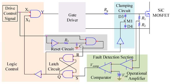 During the fault process, the fault current will cause an evident change in the gate-source voltage because of the existence of the Miller capacitance []. Thus, the fault can be detected by the change of gate-source voltage. Figure 3 shows the schematic diagram of the fault detection circuit based on gate-source voltage variation.