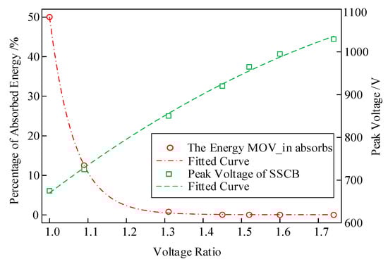 Absorbed energy and peak voltage at varying voltage ratio.
