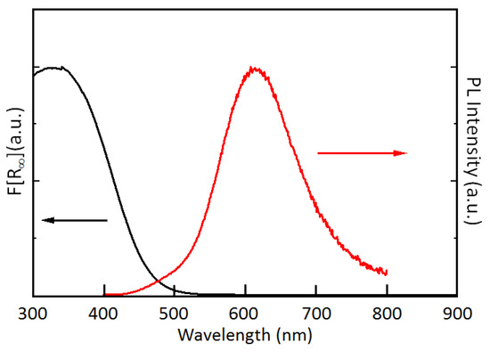 Photoluminescence (PL) and plots of F[R∞] vs. wavelength for the powder form of the decane-terminated silicon quantum dot (SiQD-De) specimen. F[R∞] of the powder form is the Kubelka−Munk function, with F[R∞] = (1 − R∞)2/2R∞.