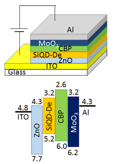 Figure 2 schematically illustrates a device architecture and its flat energy band diagram for our Si-QLED that exhibits the EL spectrum peaking at 620 nm. The device was constructed on a 150 nm thick layer of the ITO cathode (resistivity = 10−14 Ω/sq). The anode was a 150 nm thick Al film deposited under a vacuum. As shown in the drawing, the QLED consisted of an inverted device architecture with a multilayer structure, as reported in the literature [30,31]. In contrast to the conventional device structure, the electrons and holes were injected from the ITO and Al electrodes in the inverted device structure, respectively. The multilayered structure used here has constituent layers in the following order: ITO/ZnO/SiQD-De/CBP/MoO3/Al. The local surface work function of the MoO3 film was measured by photoelectron yield spectroscopy as 6.2 eV. According to the previous paper [30], the values of the work function of MoO3 films are influenced by the chemical composition of the films. In this work, a 30 nm thick MoO3 film deposited in 10−5 Pa vacuum conditions provided a local surface work function as low as ~6.2 eV. The electrons are transported to the SiQD layer through the electron injection and transportation layers (EIL/ETL) of the ZnO nanocrystal layer. On the other hand, the holes are transported to the SiQD layer through the hole injection and transportation layers (HIL/HTL) of the MoO3 and CBP layers. As illustrated in the energy diagram, the layer of ZnO exhibits a low electron affinity (−4.3 eV), being close to the value of the ITO, to facilitate the injection of electrons, leading to a low turn-on voltage. Furthermore, we expect that a low value in the work function of the ZnO layer (−7.7 eV) possibly suppresses a hole leakage current.