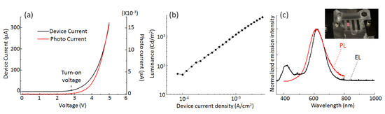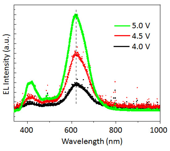 Figure 3 illustrates a typical performance of the Si-QLED in terms of the device current−voltage, the photocurrent−voltage, the luminance−voltage, and the EL spectrum compared to the PL spectrum. Figure 3a shows the current−voltage (I−V) characteristics along with the photodiode J−V characteristics. A calibrated Si photodetector (Hamamatsu S1336 8BQ, Hamamatsu Photonics) coupled with a Keithley 2423 was used for this measurement. The number of photons, collected directly with the photodetector, emitted from the ITO side, increased with the current. The turn-on voltage, which is defined as the minimum applied bias where the QLED starts to emit light, was estimated from the photodiode J−V characteristics. The estimated turn-on voltage was 2.8 V, which is as small as the value of the normal Si-QLED emitting the light peaking at 625 nm [27]. It is reported that the turn-on voltage is influenced by the device composition rather than the QD size [27]. Therefore, the observation of the low turn-on voltage for our device confirms the presence of a small barrier height for the charge injection into the photoactive layer from the electrodes. Figure 3b plots the typical luminance curves as a function of the applied voltage. The luminance reaches a value as high as 4200 cd/m2 at 5 V. The EL spectrum has a peak at 620 nm which shifts 3 nm to red when compared to the corresponding PL spectrum, as shown in Figure 3c. The EL spectrum is as narrow as 95 nm (~283 meV) fwhm, as evidenced in Figure 3c, and is slightly narrower than the PL spectrum. The observation of the negligible spectral shift (~3 nm) and the value of fwhm smaller than the PL linewidth indicates the effective suppression of the quantum-confined Stark effect, although further study is needed for clarification of the mechanism. The inset of Figure 3c shows a photograph of the QLED operating at 5 V, indicating that the light emitted from the QLED is sufficiently bright and vivid to be visible to the naked eye even in an illuminated room. However, the color purity of the pale orange was lower than our expectation in spite of the narrow linewidth of the spectrum without an emission tail. The low purity of color might be due to the appearance of another EL spectrum peaking at around 420 nm, while such a blue emission is not observed in the PL spectrum. The EL spectra exhibit the voltage dependence, as shown in Figure 4. The spectral profile at 4 V bias shows the EL peak at 620 nm, and we see a small luminance contribution (λem = ~420 nm) from a layer among the multilayers, leading to the low purity of the pale-orange color. This parasitic EL emission at 420 nm might originate from the neighboring compositional layer of ZnO. As the voltage increases, the parasitic EL intensity from the layer of ZnO increases. On the other hand, the EL intensity originating from the ncSi-De layers also grows under increasing applied bias voltage. There are two possible reasons to explain the appearance of the parasitic emission. First, according to the flat energy band diagram, there is an energy gap of 0.9 eV between the ZnO and the ncSi-De layers. Due to this energy barrier that blocks the carrier transportation, some of the electrons injected from the ITO electrode remained in the conduction minimum of ZnO, yielding the recombination for blue EL. The other possible reason is that this unwanted emission in the blue range appears due to an insufficient thickness of ncSi-De [28]. A further extension of voltage is needed to discuss the underlying physics in which the parasitic emission happens. Figure 4 demonstrates a couple of advantages of the inverted device structure. First, there is no shift of the EL peak with increasing operation voltage, indicating that the EL emission at 620 nm originates solely from the QD layer even in the high applied voltage range. In contrast, it is well known that the EL peak shift to blue for conventional structures of the QLED of semiconductors includes Si [25,26,32]. Second, the EL spectral shape is independent of driving voltage. It is important to note that emission spectral characteristics, such as EL peak position and shape, are not influenced by the presence of the parasitic emission spectrum. Therefore, the observed stability of the EL characteristics could be due to a good conductivity in the band alignment of HTL which leads to the difficulty in the buildup of the band-filling. In terms of the EL stability under increasing operation voltage, the use of metal oxide layers (i.e., ZnO and MoO3) for the EIL/ETL and the HTL/HIL takes advantage of the inherent robustness and protection of the interlayers from oxidation. We measured the photocurrent as the EL output with a photodetector to estimate the EQE and plotted the values in Figure 5 as a function of the injected current density. The peak value of EQE was estimated to be 0.033%, which is currently a record value for a Si-QLED operating in the pale-orange emission range. An enhancement of the EQE might be obtained by a good band alignment of our inverted device structure. Decreasing the degree of the charged QDs, which leads to carrier loss due to Auger recombination, would contribute to the enhanced EQE [33].