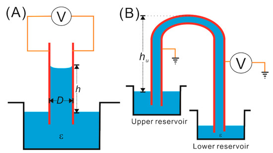 Schematic representation of (A) Pellat’s classic experiment of dielectric liquid actuation against gravity by a non-homogeneous electric field, and (B) dielectric siphon.