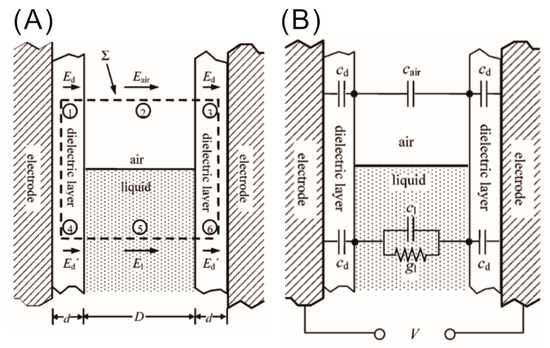 (A) Schematic representation of the closed surface integral and corresponding area for calculation of net vertical force of electrical origin on the liquid between insulator-coated electrodes. The choice of closed surface integral is reduced to a simple summation of six discrete areas denoted by 2 for the contribution of air, 5 for the contribution from liquid, and 1 and 3, and 4 and 6 for the contribution from the dielectrics above and below the air–liquid interface, respectively. (B) Schematic representation of the equivalent resistor/capacitor (RC) circuit model for determination of the electric field in different regions. Images are reproduced from Reference [30] with the permission of the American Chemical Society.