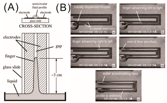 Highly insulating liquid actuation by liquid dielectrophoresis (LDEP) forces using co-planar micro electrodes. (A) Cross-sectional view of a dielectric liquid drop sitting on co-planar microelectrodes, and the top view of the spreading of the liquid, stretching like a liquid finger along the gap between the electrodes. (B) Sequence of the snapshots of the video micrographs demonstrating water transportation by LDEP force along the patterned electrode gap. Images are adopted from Reference [31] with the permission of Elsevier.
