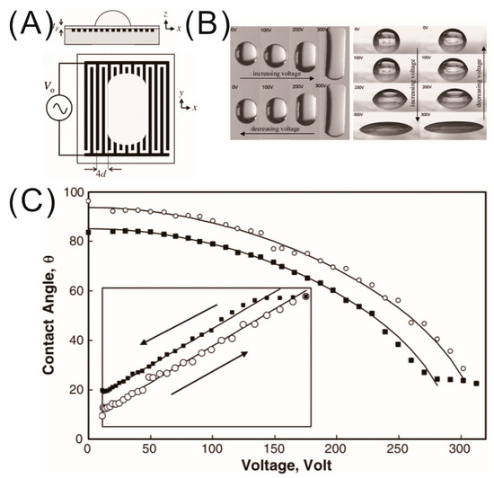 In the same paper, McHale et al. experimentally confirmed the relationship between the contact angle and applied voltage using a polypropylene droplet on a substrate with linear IDE as shown in Figure 4 [21]. A hydrophobic thin top coating was employed to start the experiment with a high initial contact angle for large modulation of the contact angle. As shown in Figure 4C, the apparent contact angle of the droplet exhibited a large modulation of around 70° upon application of a voltage of 300 V, overcoming the contact-angle saturation limit usually observed in EWOD experiments. However, a small hysteresis between the increasing and decreasing voltage cycle was observed. This irreversibility of the apparent contact angle arises from the pinning of three-phase contact line at the surface roughness, which was resolved later by Brabcova et al. by infusing a lubricant in the roughness of the substrate [39]. The inset of Figure 4C shows a clear linear dependence of the cosine of the apparent contact angle with the square of the applied voltage , which confirms the relationship of Equation (17). Moreover, Equation (17) predicts that, for a sufficiently high threshold voltage (), the droplet could be spread to a thin film with zero contact angle. With this threshold voltage ), the dielectrowetting behavior can be predicted by the following model [23]: