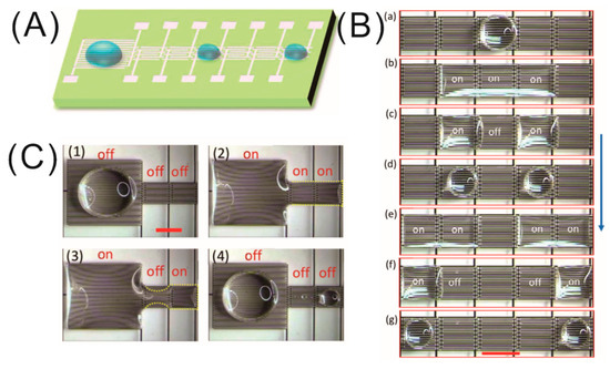 (A) Schematic representation of the experimental open microfluidics device with a large IDE pad for a reservoir and smaller IDE pads for various microfluidics operations. (B) Series of snapshots explaining the droplet splitting (a–d) and transporting (e–g) operations. Scale bars are 2 mm. (C) Droplet generation on the device by dielectrowetting. Scale bars are 2 mm. Images are reproduced from Reference [41] with the permission of the Royal Society of Chemistry.