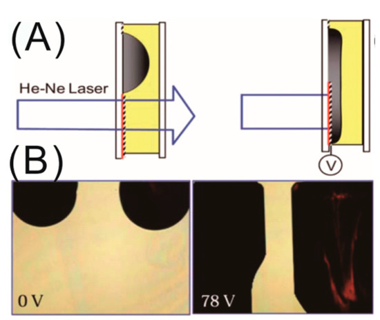 (A) Schematic representation of the working principle of the optical switch based on dielectrowetting spreading of liquid drop. (B) Liquid crystal droplet-based optical switches in the off and on (78 V) state. The left droplet shows a black color and the right one shows red. Images are reproduced from Reference [66] with permission of the Royal Society of Chemistry.