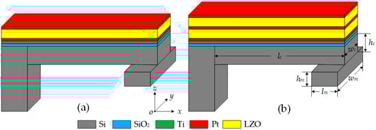 As shown in Figure 1, we present two structural models: Single and double piezoelectric layer structures, called model I and model II, respectively. They consist of Pt/Li-doped ZnO (LZO)/Pt/Ti thin films grown on a SiO2/Si cantilever beam substrate with a proof mass at the end. A Ti thin film was placed as a transition layer to ensure that the Pt and SiO2 layers were bonded closely. A Pt thin film was utilized as top, middle (in model II), and bottom electrodes (TE, ME, and BE). Model I is a typical single piezoelectric sandwich structure, and model II is a double piezoelectric layer structure. In model II, LZO thin films were placed among the electrodes to form a series structure in order to increase output voltage sensitivity. In Figure 1, lc, wc, and hc refer to the length, width, and height of the cantilever beam, respectively, and lm, wm, and hm are the length, width, and height of the mass block, respectively.
