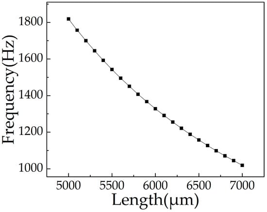 The sensor was designed for the health detection of the lathe tool (SNR-0020R-16), the lathe tool’s resonance frequency is about 1300 Hz. On the premise of ensuring that the sensor can be installed on the lathe tool normally, meanwhile, in order to guarantee the requirement of sensitivity, we designed the wc to be 2400 μm; considering that under the action of the mass, the irreversible bending of the cantilever beam will occur when hc is too small, therefore, hc is designed to be 80 μm, and the size of proof mass is 1000 μm × 2700 μm × 395 μm. In this design, f is controlled by changing the value of lc. Figure 2 shows the ANSYS simulation curve of resonance frequency varying with lc. When the beam length is 6000 μm, the resonance frequency is 1327.7 Hz, which is close to that of the lathe tool. The cantilever beam is designed to be 6000 μm × 2400 μm × 80 μm in size.