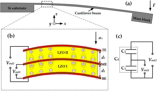 Figure 3 shows the operating principle of the proposed acceleration sensor. With applied acceleration, the force (F) produced by the mass block acts on the tip of the cantilever beam, causing deformation of the cantilever beam (Figure 3a). Figure 3b shows the operating principle of the multilayer structure; d1 and d2 are the thickness of the lower and upper LZO thin films (LZO I and LZO II), respectively. Normally, without the action of external acceleration, the center of the positive and negative charges of the LZO thin film will coincide with each other, and the whole LZO thin film will be electrically neutral when external acceleration along the z-axis acts on the cantilever beam. The force produced by the mass block causes deformation of the cantilever beam, and the centers of the positive and negative charges are separated, which leads to positive and negative charges appearing on the top and bottom sides of the LZO thin film. Therefore, the LZO thin film can be equivalent to a capacitor. In the double piezoelectric layer structure, the charges generated by deformation on both sides of the ME are neutralized with each other and the total charge q remains unchanged. The double piezoelectric layer structure can be equivalent to the double capacitor series mode, which is given in Figure 3b, and the total capacitance is Cd. Vout1 is the output voltage between ME and BE, and the sensor works as model I. Vout2 is the output voltage between TE and BE, and the sensor works as model II.