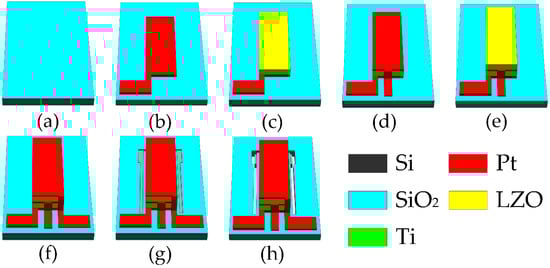 Main fabrication process of the chip: (a) Growing SiO2; (b) depositing Ti/Pt; (c) sputtering Li-doped ZnO (LZO) I; (d) depositing Pt; (e) sputtering LZO II; (f) depositing Pt; (g) etching on the top side; (h) releasing cantilever beam.