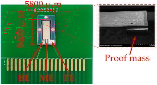 As shown in Figure 5, the chip of the proposed sensor was fixed on the printed circuit board (PCB). Holes were made in the PCB below the cantilever beam to make sure the proof mass could move up and down freely when the cantilever beam was deformed. The chip size was 9400 μm × 5800 μm. Chip electrodes were connected with the PCB pads by a chip press welder (KNS4526, Kullicke & Soffa, Haifa, Israel).